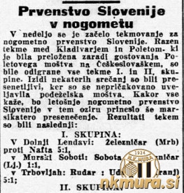 1.Železničar MB 1 1 0 0 5:1 2 2.Rudar Trbovlje 1 1 0 0 5:1 2 3.Sobota 1 0 1 0 1:1 1 4.Železničar LJ 1 0 1 0 1:1 1 5.Polet 0 0 0 0 0:0 0 6.Kladivar 0 0 0 0 0:0 0 7.Nafta 1 0 0 1 1:5 0 8.Udarnik Kranj 1 0 0 1 1:5 0