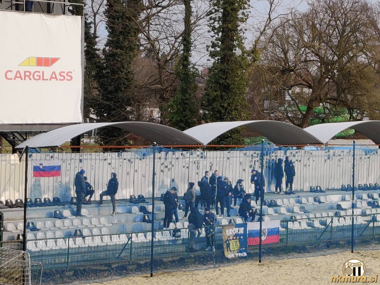 Tekmo si je ogledalo tudi dvajset Celjskih Grofov, ki so v svojem sektorju izobesili slovensko zastavo. Najverjetneje kot odgovor Gorgonam, ki so pred dvema tednoma na tem mestu poveličevale madžarsko zastavo. Avtorske pravice: nkmura.si Foto: Simon Horvat