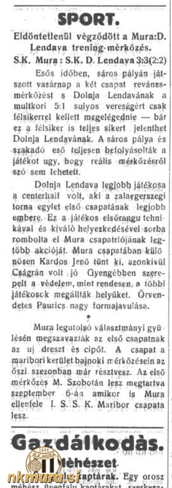 Nogometaši Dolnje Lendave in Mure so odigrali povratno prijateljsko tekmo, ki se je končala z rezultatom 3:3 (2:2). Prvo prijateljsko tekmo so dobili Lendavčani s 5:1. Tekma je potekala v dežju in na blatnem igrišču. Posledično je bila tekma zelo težka za obe ekipi.