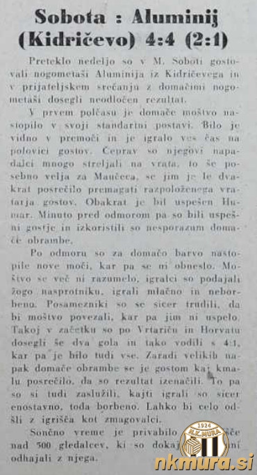 Nogometaši Sobote so odigrali zadnjo pripravljalno tekmo pred nadaljevanjem spomladanskega dela prvenstva. V Murski Soboti je gostoval Aluminij, tekma pa se je končala s 4:4 (2:1). Tekmo je spremljalo okrog 500 gledalcev.