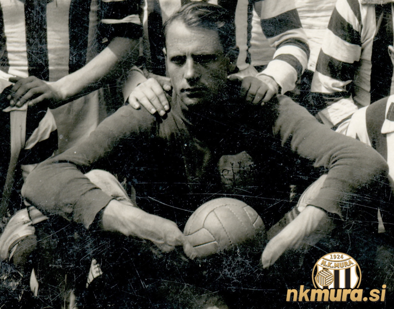 Vratar Mure, Ludvik Szilagyi, drži v rokah žogo s katero je Mura igrala leta 1934. Žoga je sestavljena iz osemnajstih delov, ki so bili razporejeni v šest plošč. Ko se je taka žoga "napila" vode je postajala vse težja. Avtorske pravice: nkmura.si Foto: Jerolim Purač