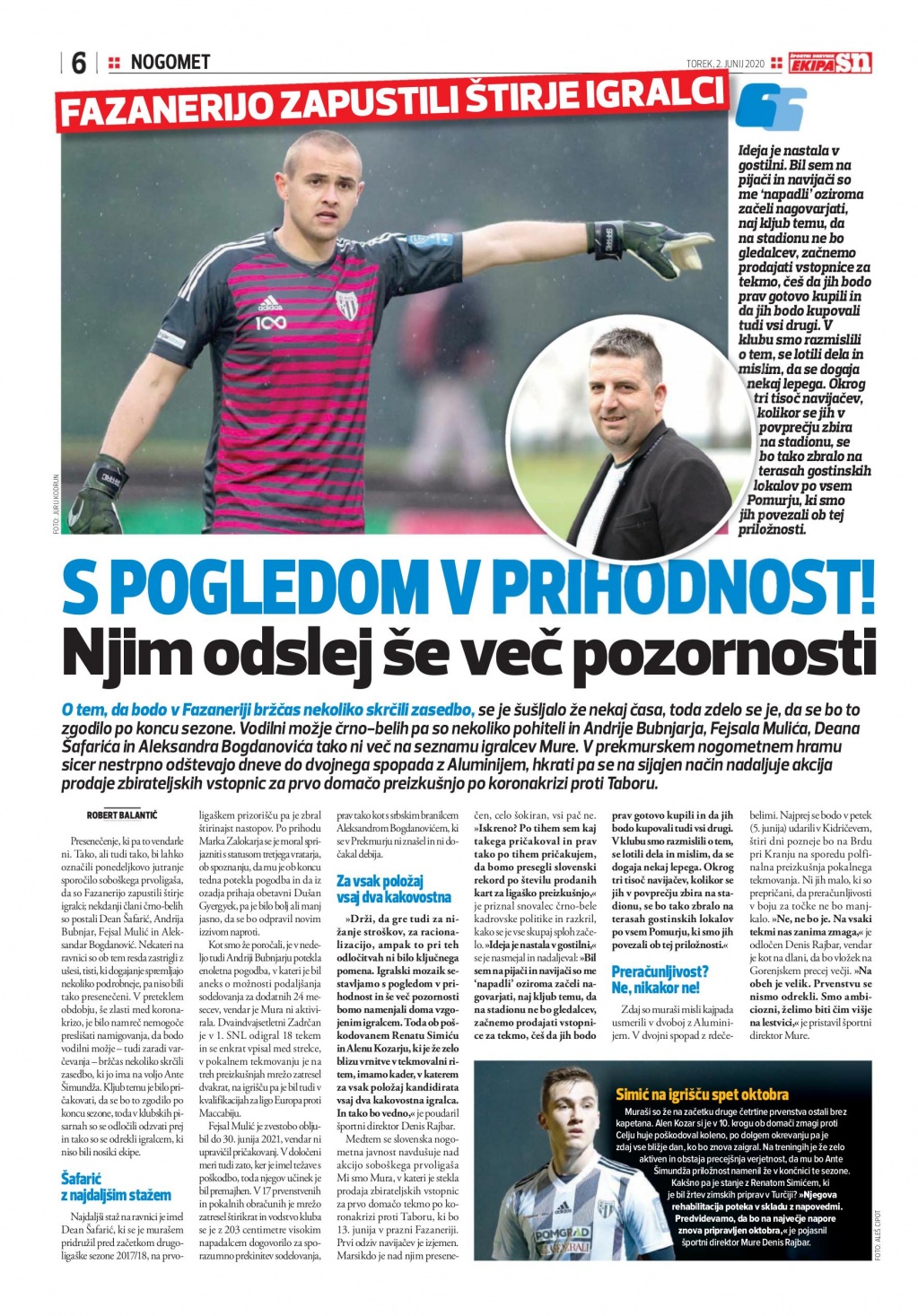 Športni direktor Denis Rajbar je dejal, da bodo več pozornosti posvečali doma vzgojenim nogometašem. Prav tako je dejal, da se je ideja o akciji Mi smo Mura (karte za tekme brez gledalcev), rodila v gostilni, ko so ga navijači spraševali ali bo klub prodajal karte za tekme brez gledalcev.
