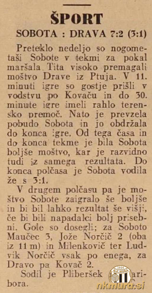 Nogometaši Sobote so v tekmi pokala maršala Tita gostili ptujsko Dravo in zmagali s 7:2 (3:1). Z zmago so se uvrstili v podzvezni polfinale v katerem bodo igrali proti Mariboru.