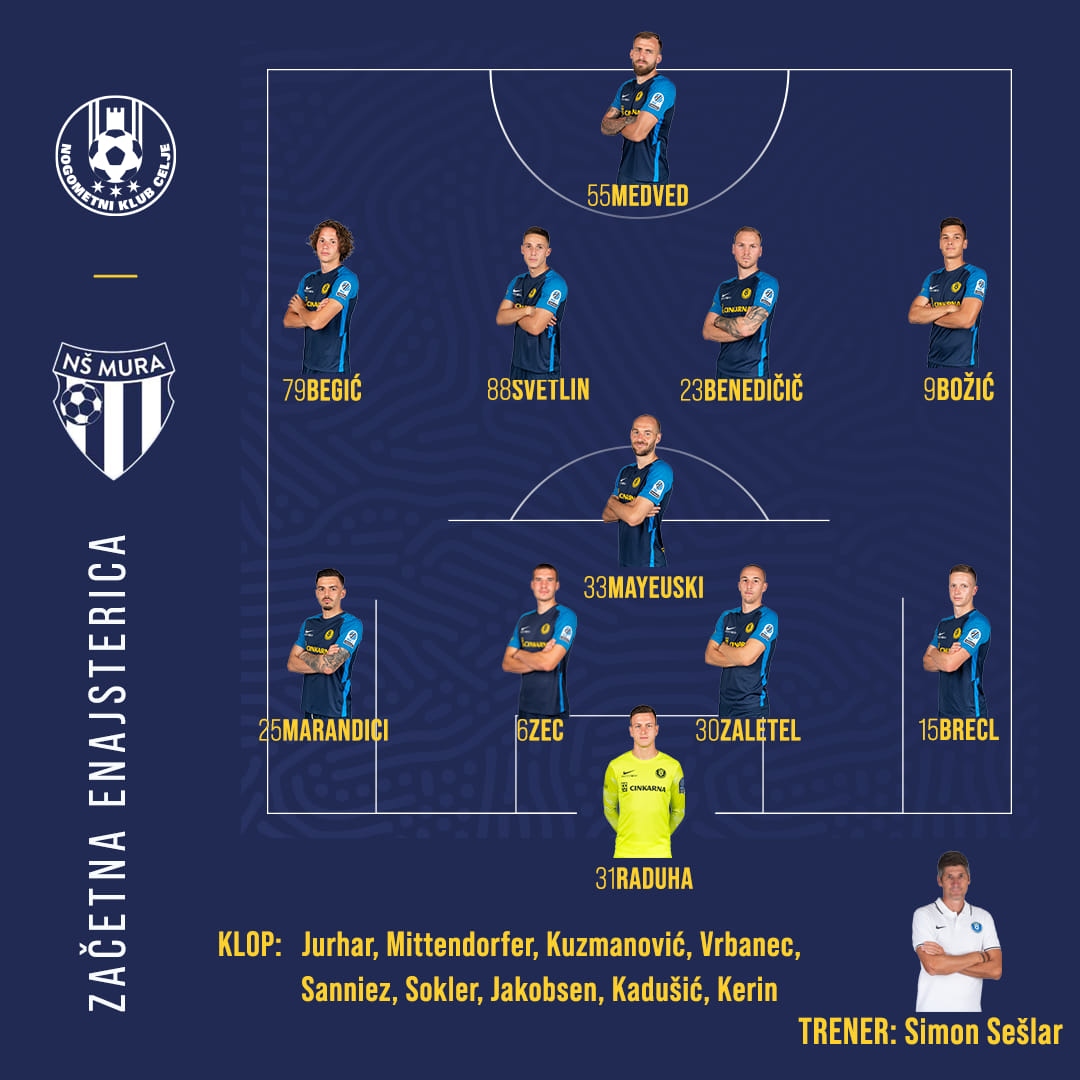 Celje: Raduha, Brecl (od 81. Kadušić), Zaletel, Zec, Marandici, Majevski, Božić, Benedičič (od 73. Jakobsen), Svetlin, Begić (od 80. Vrbanec), Medved (od 80. Sokler). Trener: Simon Sešlar.