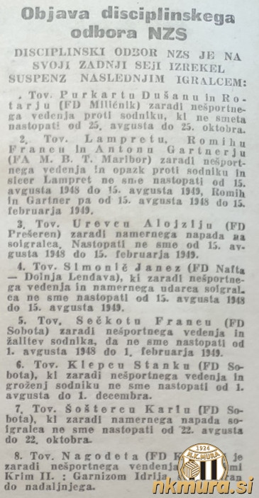 Stanko Klepec zaradi nešportnega vedenja in groženj sodniku ne sme nastopati od 1. avgusta do 1. decembra 1948.