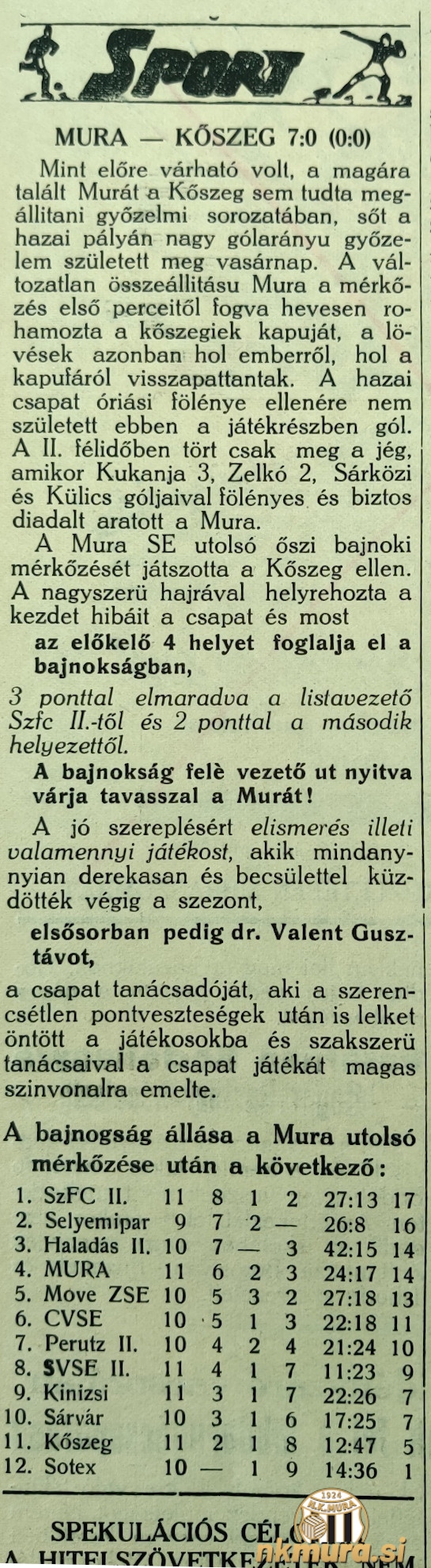 V zadnjem jesenskem krogu so se črno-beli na Fazaneriji pomerili s Kőszegom in ga premagali s kar 7:0 (0:0). To je bila najvišja zmaga Mure v sezoni.