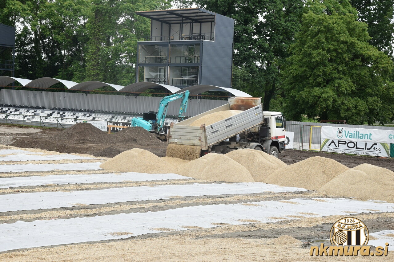 V 20 cm frakcije bodo položili namakalni sistem. Na frakcijo pride talno gretje, ki ga bodo zasuli s posebno kombinacijo peska. Peska bo cca 25 cm. Na koncu pride 4 cm travnate ruše. Travnato rušo bodo pripeljali v t.i. "balah". Ena bala bo dovolj za 1,2 krat 10 metrov igrišča.