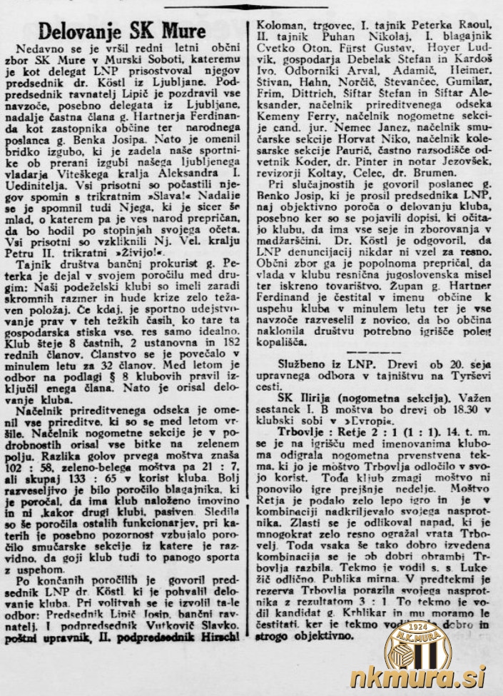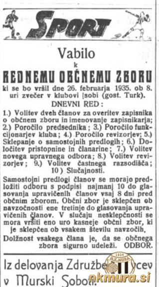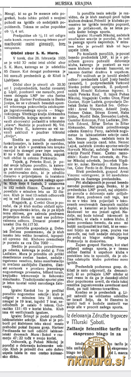26. februarja 1935, je v prostorih gostilne Turk potekal XI. redni občni zbor SK Mure. Predsednik kluba je postal bančni ravnatelj, Josip Lipič, ki je zamenjal Vincenca Arvaija, ki je klub vodil zadnja tri leta. Lipič je tako postal sedmi predsednik SK Mure. Podpredsednika sta postala Slavko Vutkovič in Koloman Hirschl.