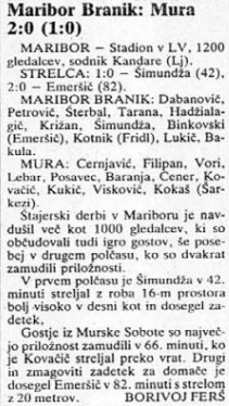 Nogometaši Mure so v 9. krogu 1. SNL 1991/1992 gostovali v Mariboru in kljub dobri igri doživeli poraz z 2:0. Mrežo Černjaviča je prvi zatresel Ante Šimundža v 42. minuti. V drugem polčasu je imela Mura lepe priložnosti za izenačenje, najlepšo pa je v 66. minuti zamudil Robert Kovačič, ko je streljal prek vrat. Za domačine je zmagoviti zadetek dosegel Tomaž Emeršič v 82. minuti.