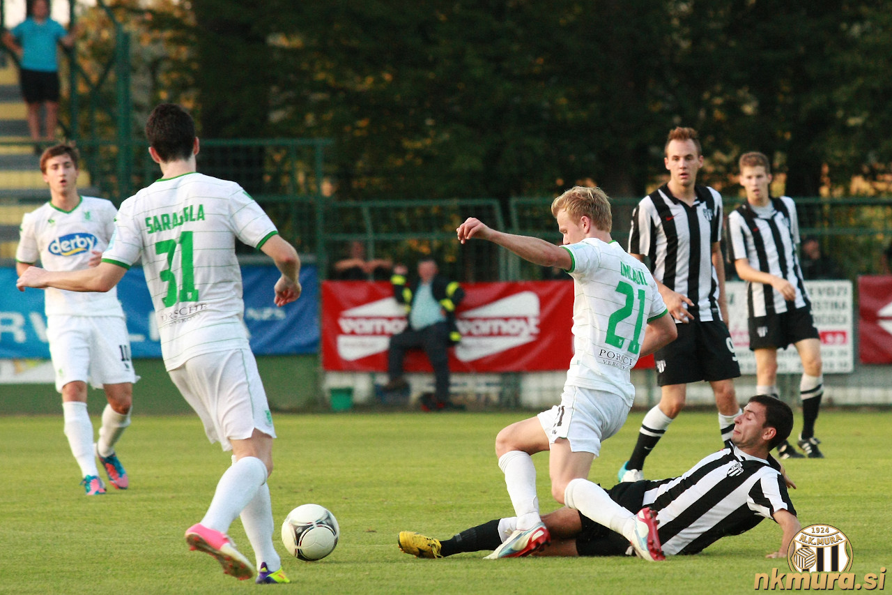 Tekma 4. kroga sezone 2012/13 med Muro 05 in Olimpijo. Na tleh je Arpad Vaš. Akcijo opazujeta Matic Maruško in Denis Kramar. Avtorske pravice: nkmura.si Foto: Gregor Čiček
