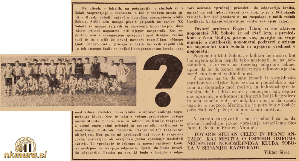 Evgen Titan: "Nogometni klub Sobota, v kolikor bo moštvo kot homogena celota uspela tako nastopati, ne pa individualno, z ozirom na dosedaj odigrane tekme, upam da bo do konca omenjenega tekmovanja dosegel eno izmed vodilnih mest. Z ozirom na to, da smo izpadli iz varaždinsko mariborsko celjske lige, izražam pomisleke z ozirom na dejansko moč moštva in kakovost igre in menim, da bi lahko ostali v omenjeni ligi, čeprav nas opravičuje odsotnost nekaterih boljših igralcev in sem končno tudi jaz nekako mnenja, da zaradi tega to ni mogoče. Menim, da je potrebno v bodoče posvečati več pažnje mladinskemu moštvu."