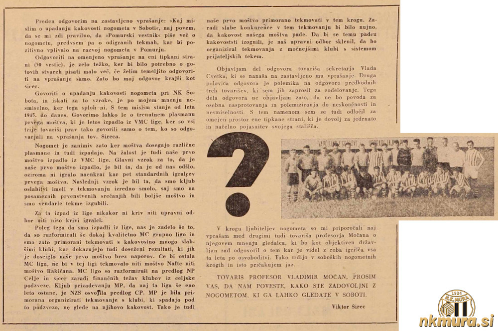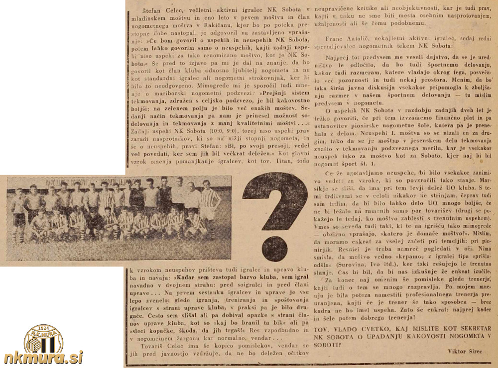 Sekretar kluba Vlado Cvetko: "Govoriti o upadanju kakovosti nogometa pri NK Sobota, in iskati za to vzroke, je po mojem mnenju nesmiselno, ker tega sploh ni. S tem mislim stanje od leta 1945. do danes. Govorimo lahko le o trenutnem plasmanu prvega moštva, ki je letos izpadlo iz VMC lige. Nogomet je zanimiv zato ker moštva dosegajo različne plasmane in tudi izpadajo. Na žalost je tudi naše prvo moštvo izpadlo iz VMC lige. Glavni vzrok za to, da je naše prvo moštvo izpadlo, je bil da, da je od nas odšlo, oziroma ni igralo naenkrat kar pet standardnih igralpev prvega moštva. Naslednji vzrok je bil ta, da smo kljub oslabitvi imeli v tekmovanju izredno smolo, saj smo na posameznih prvenstvenih srečanjih bili boljše moštvo in smo vendarle tekme izgubili.Za ta izpad iz lige nikakor ni kriv niti upravni odbor niti niso krivi igralci." Cvetko se je obreknil tudi na sistem tekmovanja, saj so mariborsko-celjsko (MC) ligo razbili na dve ligi. Sobočani tako tekmujejo v kakovostno slabi mariborski podzvezni ligi. "Poleg tega da smo izpadli iz lige, nas je zadelo še to, da so razformirali še dokaj kvalitetno MC grupno ligo in smo zato primorani tekmovati s kakovostno mnogo slabšimi klubi, kar dokazujejo tudi doseženi rezultati, ki jih je doseglo naše prvo moštvo brez naporov. Če bi ostala MC liga, ne bi v tej ligi tekmovalo niti moštvo Nafte niti moštvo Rakičana. MC ligo so razformirali na predlog NP Celje in sicer zaradi finančnih težav klubov iz celjske podzveze. Kljub prizadevanju MP, da naj ta liga še eno leto ostane, je NZS osvojila predlog CP. MP je bila primorana organizirati tekmovanje s klubi, ki spadajo pod to podzvezo, ne glede na njihovo kakovost. Tako je tudi naše prvo moštvo primorano tekmovati v tem krogu. Zaradi slabe konkurence v tem tekmovanju bi bilo nujno, da kakovost našega moštva pade. Da bi se temu padcu kakovosti izognili, je naš upravni odbor sklenil, da bo organiziral tekmovanja z močnejšimi klubi s sistemom prijateljskih tekem."
