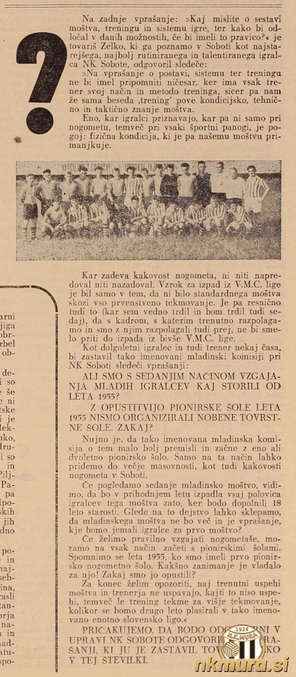 Svoje mnenje je podal še eden najbolj izkušenih in rutiniranih igralcev Feri Zelko. Na vprašanje, kaj misli o sestavi moštva, treningu in sistemu igre ter kako bi odločal v danih možnostih, če bi imel to pravico je dejal: "Na vprašanje o postavi, sistemu ter treningu ne bi imel pripomniti ničesar, ker ima vsak trener svoj način in metodo treninga, sicer pa nam že sama beseda 'trening' pove kondicijsko, tehnično in taktično znanje moštva. Eno, kar igralci priznavajo, kar pa ni samo pri nogometu, temveč pri vsaki športni panogi, je pogoj: fizična kondicija, ki je pa našemu moštvu primanjkuje." Po Zelkovem mnenju je bil vzrok za izpad iz MVC lige preveč sprememb v moštvu. "Kar zadeva kakovost nogometa, ni niti napredoval niti nazadoval. Vzrok za izpad iz MVC lige je bil samo v tem, da ni bilo standardnega moštva skozi vso prvenstveno tekmovanje. Je pa resnično tudi to (kar sem vedno trdil in bom trdil tudi sedaj), da s kadrom, s katerim trenutno razpolagamo in smo z njim razpolagali tudi prej, ne bi smelo priti do izpada iz bivše MVC lige," je dodal Zelko. Sobota že od leta 1955 ni organizirala poionirske šole. Zelko tudi v tem vidi enega od problemov. "Nujno je, da tako imenovana mladinska komisija o tem malo bolj premisli in začne z eno ali dvoletno pionirsko šolo. Samo na ta način lahko pridemo do večje masovnosti, kot tudi kakovosti nogometa v Soboti. Če pogledamo sedanje mladinsko moštvo, vidimo, da bo v prihodnjem letu izpadla vsaj polovica igralcev tega moštva zato, ker bodo dopolnili 18 let.. Glede na to dejstvo lahko sklepamo, da mladinskega moštva ne bo več in je vprašanje, kje bomo jemali igralce za prvo moštvo? Spomnimo se leta 1955, ko smo imeli prvo pionirsko nogometno šolo. Kakšno zanimanje je vladalo za njo! Zakaj smo jo opustili?" Zelko je za konec svojega razmišljanja dodal, da trenutni uspehi na zelenem polju ne smejo uspavati moštva. "Za konec želim opozoriti, naj trenutni uspehi moštva in trenerja ne uspavajo, kajti to niso uspehi, temveč le trening tekme za višje tekmovanje, v kolikor se bomo drugo leto plasirali v tako imenovano enotno slovensko ligo."