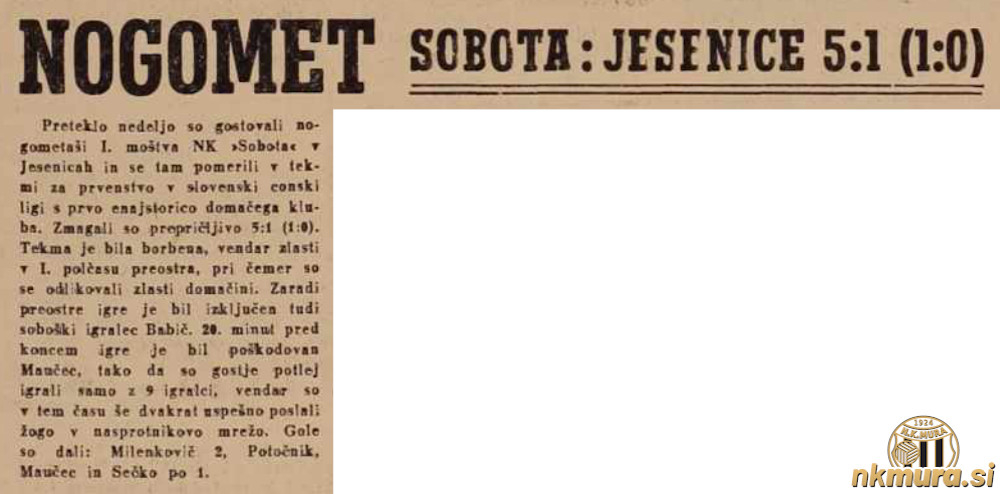 Nogometaši Sobote so v 17. krogu slovenske republiške lige gostovali na Jesenicah in zmagali z 1:5 (0:1).