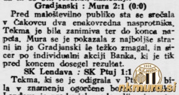 Smola tekem z Građanskim je za črno-bele skoraj neverjetna. Če na prijateljskih tekmah še nekako uspejo premagati Građanski, so povsem druga pesem tekme za točke, kjer kot po pravilu ostajajo brez točk. Mura je sicer prikazala kombinatorno igro, vendar so povsem zatajili napadalci. Častni gol za Muro je zabil centerhalf. Građanski je zmagal po individualni akciji Banka tik pred koncem tekme. Sicer pa je bila igra disciplinirana in v mejah fair playa, zato sodnik Jančič iz Maribora ni imel pretiranega dela.