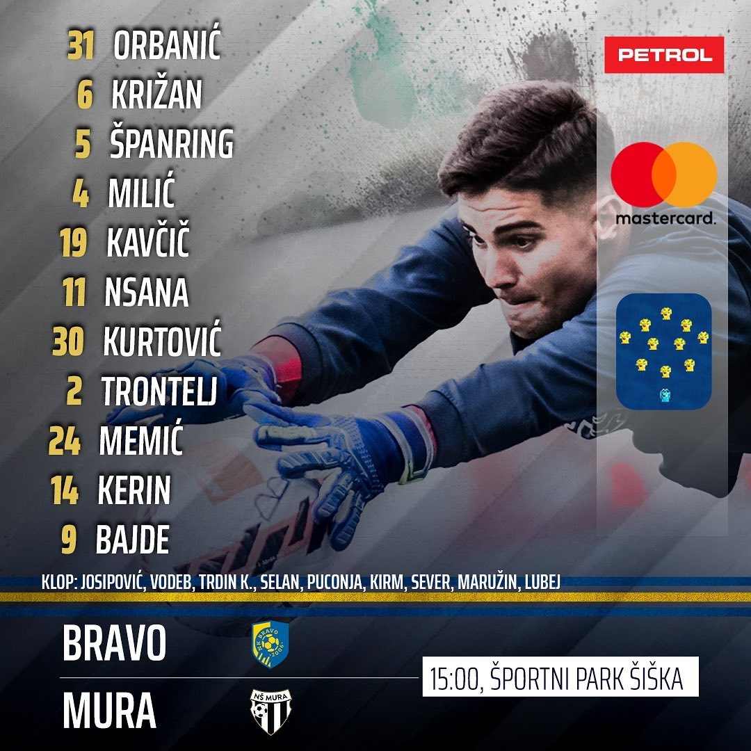 Bravo: Orbanić, Križan, Španring, Milić, Kavčič, Nsana, Kurtović, Trontelj (od 82. Maružin), Memić (od 74. Kirm), Kerin (od 86. Sever), Bajde. Trener: Dejan Grabić.
