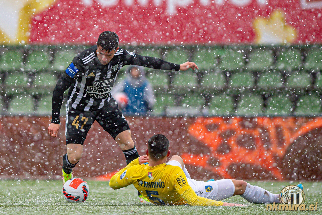 Takole je Mihael Klepač obrnil Marka Španringa in dosegel zadetek na tekmi Bravo : Mura (9. april 2022). Avtorske pravice: nkmura.si Foto: Aleš Cipot/fotolens.si