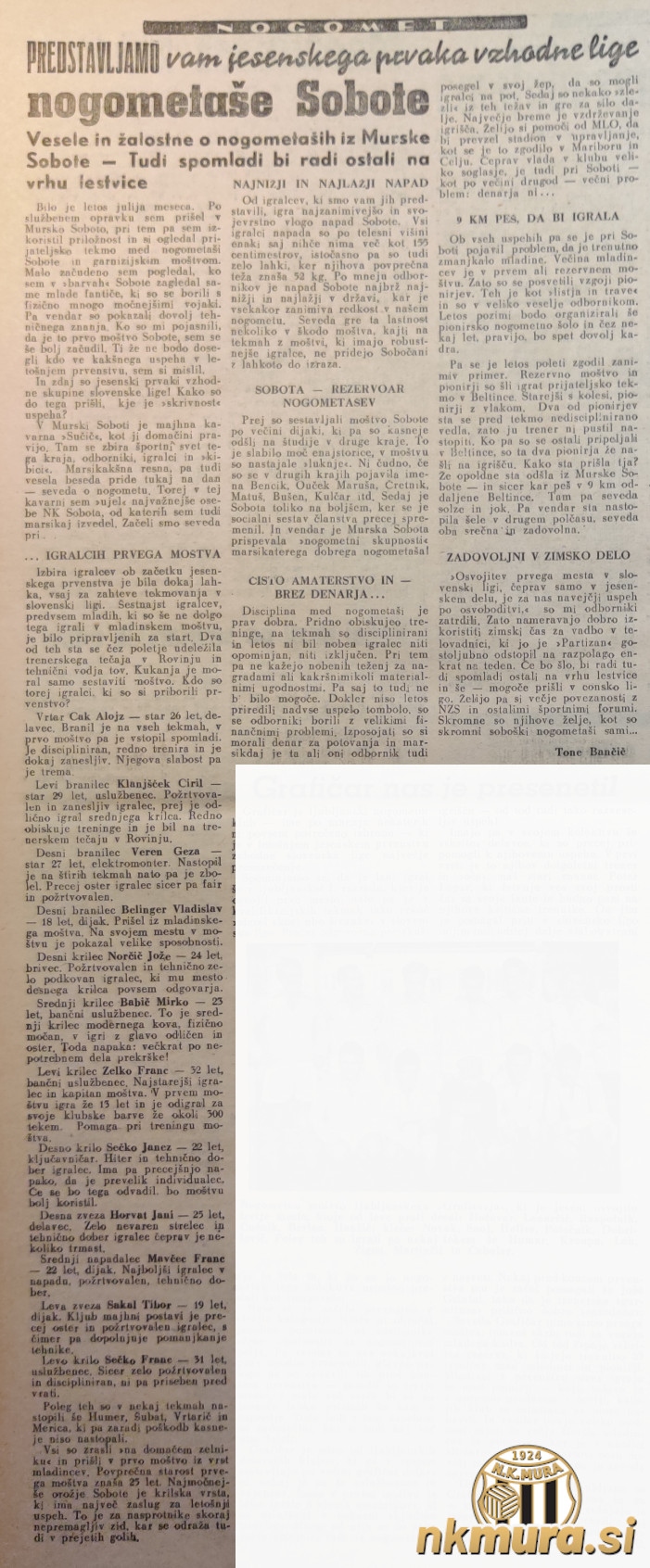 Moštvo je sestavil tehnični vodja ekipe Vladimir Kukanja, ki je zbral 16 igralcev, predvsem mladih, ki so še ne dolgo tega igrali v mladinskem moštvu. Dva izmed teh igralcev, Ciril Klajnšček in Feri Zelko, sta se poleti udeležila trenerskega tečaja v Rovinju. Slednji je pomagal pri treningu ekipe in je bil uradno tudi trener Sobote. Povprečna starost prvega moštva je znašala 25 let, najmočnejše orožje pa je bila krilska vrsta. Ta je bil za nasprotnike skoraj nepremagljiv zid, kar se je odražalo tudi v prejetih golih. Zanimivo je, da so vsi igralci zrasli na "domačem zelniku" in prišli v prvo moštvo iz mladincev. Kdo so igralci, ki so osvojili naslov jesenskega prvaka?