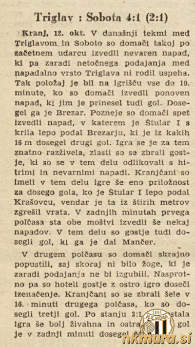 Triglav je tokrat visoko porazil Sobočane, vendar je imel pri tem nekaj sreče, saj je Soboto spremljala precejšnja smola. V začetku tekme so bili podjetnejši domačini potem ko je Brezar lepo zatresel mrežo Morčiča. V 16. minuti je Morčič tudi po lastni krivdi znova pobral žogo iz svoje mreže. Uspešen je bil Brezar. Kljub dvema zadetkoma zaostanka pa nogometaši Sobote niso vrgli puške v koruzo. S smiselnimi akcijami so vse bolj pritiskali na domača vrata in proti koncu polčasa prevladovali na igrišču. V 37. in 39. minuti je domači vratar s precej sreče rešil dva gola. Sobočani so na 2:1 znižali v 43. minuti, ko je bil uspešen Maučec.