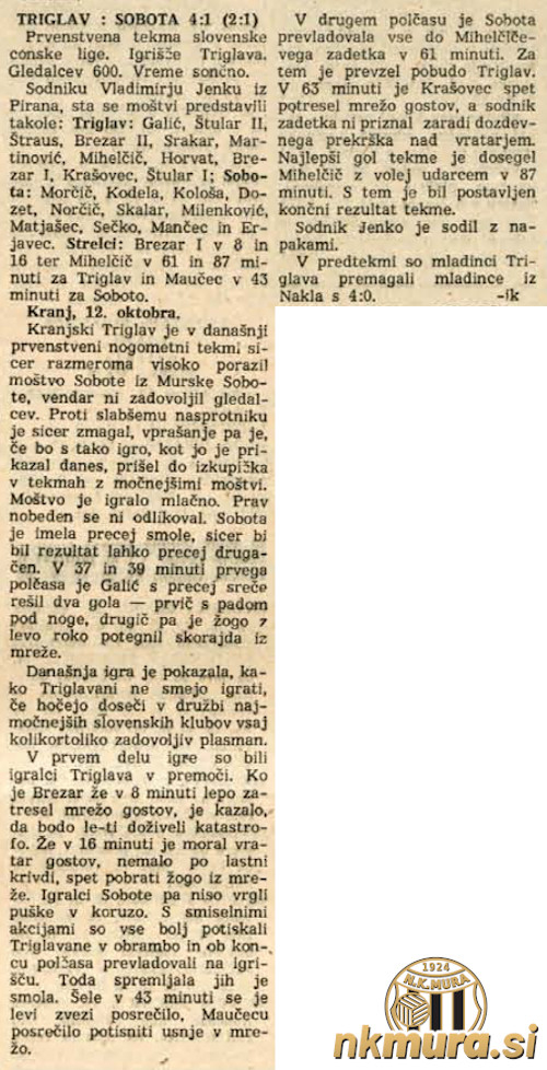 Nogometaši Sobote so v 5. krogu slovenske republiške gostovali v Kranju, kjer so se pomerili s Triglavom. Pred okrog 600 gledalci so bili boljši domačini s 4:1 (2:1).