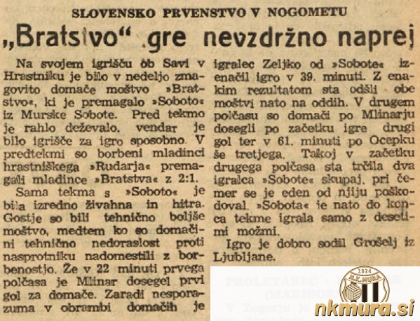 Sobota je bila tehnično boljša, vendar so domačini ta manjko nadomestili z borbenostjo. Bratstvo je povedlo v 22. minuti, ko je zadel Mlinar. Izenačil je Zelko v 39. minuti. Takoj v začetku drugega polčasa sta trčila dva igralca Sobote, pri čemer se je eden poškodoval in Sobota je do konca tekme igrala z desetimi igralci. Domačini so povedli v prvih minutah nadaljevanja, znova pa je bil uspešen Mlinar. V 61. minuti je Ocepek povišal na 3:1, kar je bil tudi rezultat tekme.