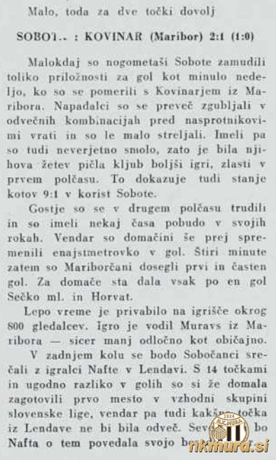 Nogometaši Sobote so v predzadnjem jesenskem krogu gostili mariborski Kovinar. Z zmago 2:1 (1:0) so se utrdili na prvem mestu, z lepimi možnostmi za naslov jesenskega prvaka.