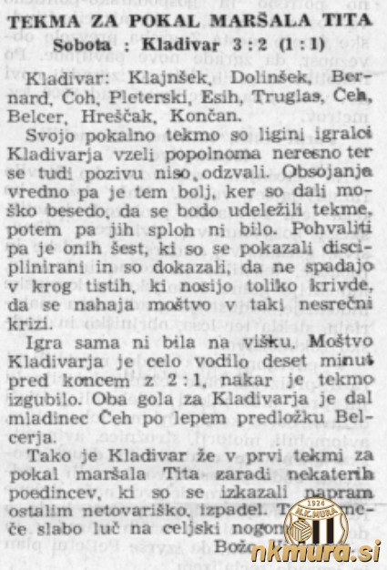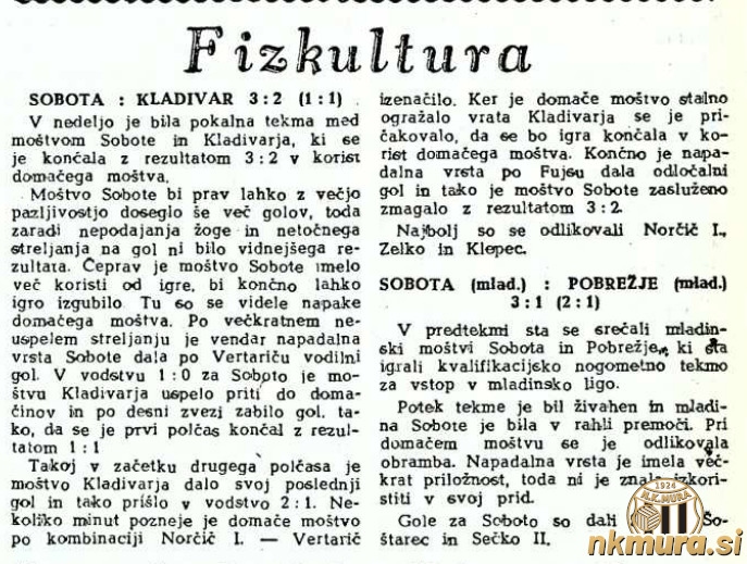 Nogometaši Sobote so v tekmi za pokal maršala Tita (pokal FLRJ) gostili celjski Kladivar in zmagali s 3:2 (1:1). Sobočani so se z zmago uvrstili v naslednji krog.