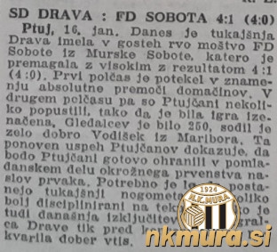 Nogometaši Sobote so v prvi tekmi v letu 1949 gostovali na Ptuju in se v prijateljski tekmi pomerili z Dravo. Ptujčani so bili boljši s 4:1 (4:0).
