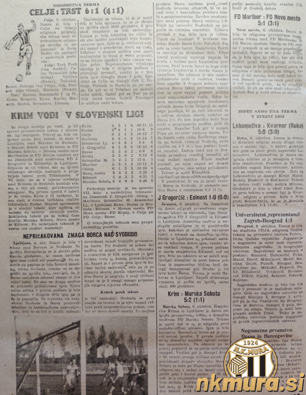 1. Krim 6 5 1 0 30:11 11 2. Rudar (T) 6 4 1 1 19:8 9 3. Celje 6 3 1 2 19:13 7 4. Svoboda 6 3 1 2 14:12 7 5. Železničar LJ 4 3 0 1 8:4 6 6. Jože Gregorčič 6 3 0 3 16:10 6 7. Borec 5 3 0 2 6:6 6 8. Kranj 5 3 0 2 9:12 6 9. Železničar MB 5 2 1 2 17:8 5 10.Maribor 5 2 1 2 12:11 5 11.Olimp 6 1 2 3 12:10 4 12.Novo mesto 5 0 2 3 5:25 2 13.Edinost 5 0 2 3 4:21 2 14.Murska Sobota 6 0 0 6 6:26 0