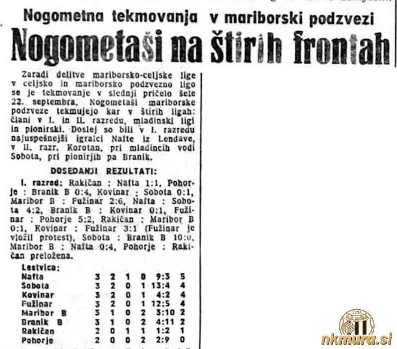 1. Fužinar 1 1 0 0 6:2 2 2. Branik B 1 1 0 0 4:0 2 3. Sobota 1 1 0 0 1:0 2 4. Nafta 1 0 1 0 1:1 1 5. Rakičan 1 0 1 0 1:1 1 6. Kovinar Maribor 1 0 0 1 0:1 0 7. Maribor B 1 0 0 1 2:6 0 8. Pohorje 1 0 0 1 0:4 0