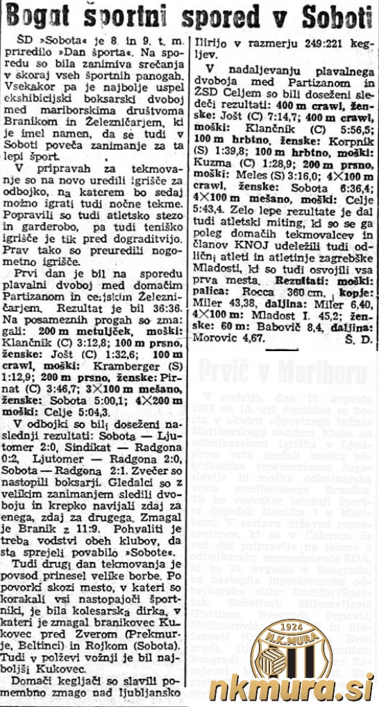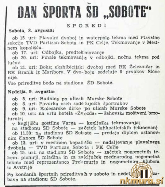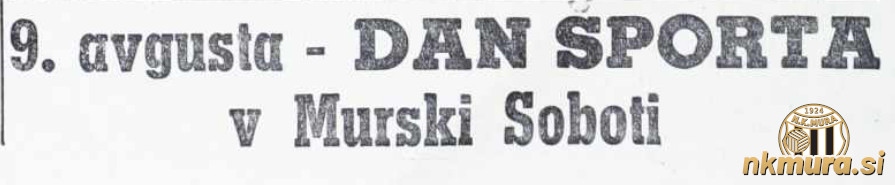V Murski Soboti je v soboto 8. in v nedeljo 9. avgusta 1953 potekal Dan športa. Pripravilo ga je novoustanovljeno društvo ŠD Sobota predvsem kot manifestacijo vseh napredno mislečih športnikov v Murski Soboti in Prekmurju. Prireditelji so želeli pri mladih vzbuditi zanimanje za različne športne panoge, ne samo za nogomet.