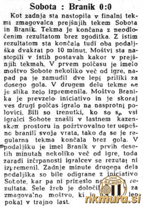 V prvem polčasu je bila Sobota boljši nasprotnik. Imeli so več od igre in zapravili dve lepi priložnosti za zadetek. V drugem polčasu je Branik prevzel iniciativo, vendar ni uspel zatresi mreže Režonje. Sledil je podaljšek 2x10 minut. V prvem podaljšku je imel več od igre Branik, v drugem pa Sobota.