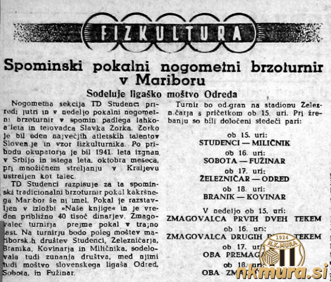 Nogometna sekcija TD Studenci Maribor je 2. in 3. julija organizirala spominski pokalni nogometni turnir v spomin na padlega lahkoatleta in telovadca Slavka Zorka. Na turnirju so sodelovale mariborske ekipe Studenci, Železničar, Branik, Kovinar in Miličnik ter Odred, Sobota in Fužinar.