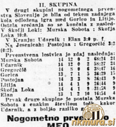 Sobota je postala prvak II. skupine in je prvo mesto zasedla zaradi boljše razlike med doseženimi in prejetimi zadetki. Kranjski Udarnik je zbral enako število točk. Na ostalih mestih je še nekaj nejasnosti, predvsem zaradi pritožb klubov na rezultate.