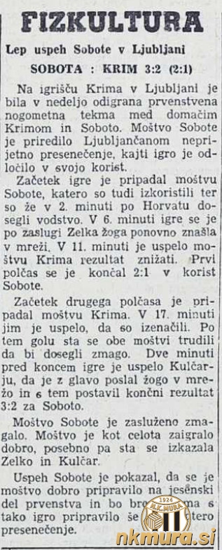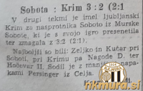 Nogometaši Sobote so v tekmi 14. kroga slovenske lige gostovali v Ljubljani pri Krimu in zmagali z 2:3 (1:2). Sobočani so se Krimu oddolžili za poraz v 1. krogu.