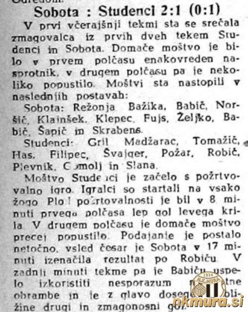 Sobota: Režonja, Bažika, Babič, Norčič, Klajnšček, Klepec, Fujs, Zelko, Babič, Šapič in Škraban.