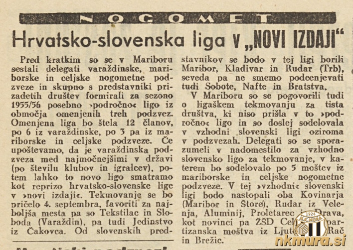 V sezoni 1955/56 je v Jugoslaviji prišlo do spremembe tekmovalnega sistema. Najvišji nivo tekmovanja bo predstavljala I. zvezna liga. Drugi nivo je razdeljen v conske lige, slovenski klubi pa bodo tekmovali v I. conski ligi, ki zajema najboljše klube iz Slovenije in Hrvaške. Tretji nivo so področne lige, med katerimi je tudi mariborsko - varaždinsko - celjska liga in na zahodu Slovenije ljubljansko - primorska nogometna liga. Klubi, ki se niso uvrstili v področno ligo pa bodo tekmovali v podzvezah, ki bodo nadomestilo za nekdanjo vzhodno in zahodno slovensko ligo.
