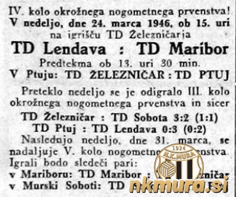 V 3. krogu tekmovanja v mariborskem telesnovzgojnem okrožju je Sobota gostovala v mariboru pri Železničarju in izgubila še tretjo prvenstveno tekmo zapored. Domačini so bili boljši s 3:2. Polčas se je končal 1:1.
