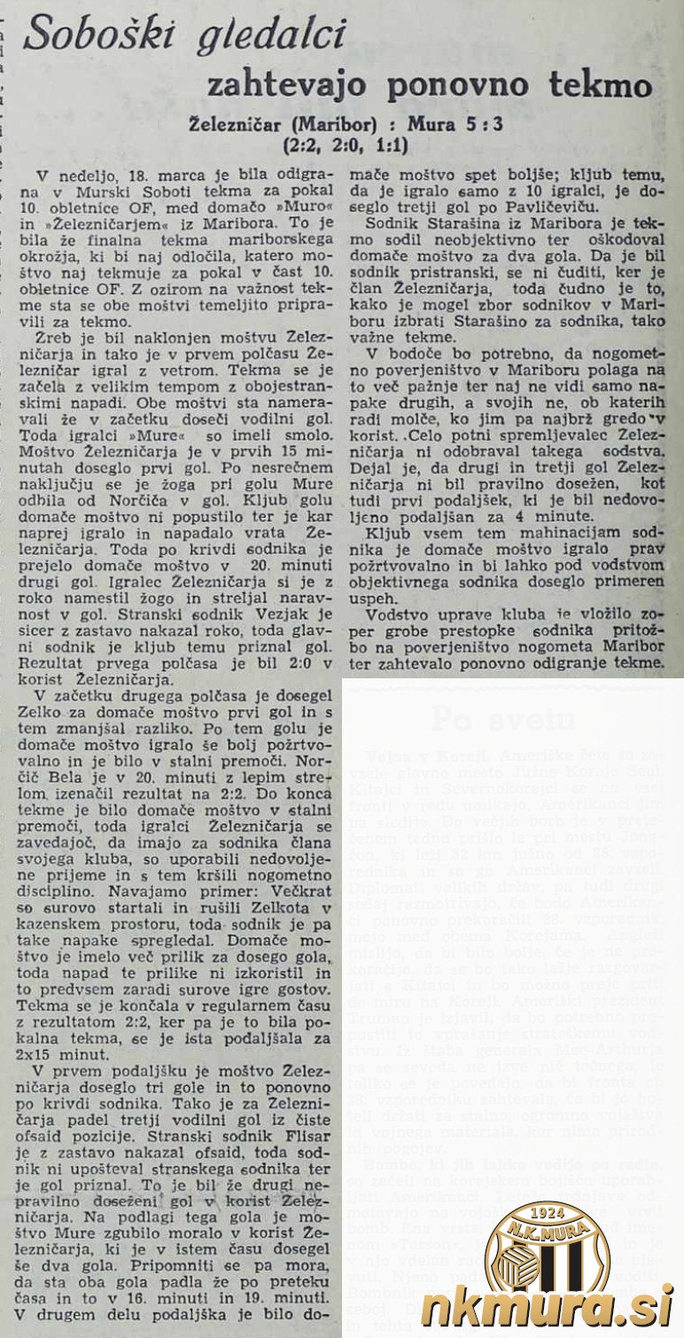 Sodnik Starašina iz Maribora je tekmo sodil neobjektivno ter oškodoval domače moštvo za dva zadetka. Omenimo naj, da gre za sodnika, ki je član Železničarja. Vodstvo Mure je po tekmi vložilo protest zoper grobe prestopke sodnika in zahtevalo ponovno igranje tekme. Pritožbo je nato obravnaval izvršni odbor NZS in tekmo verificiral z rezultatom 3:5.