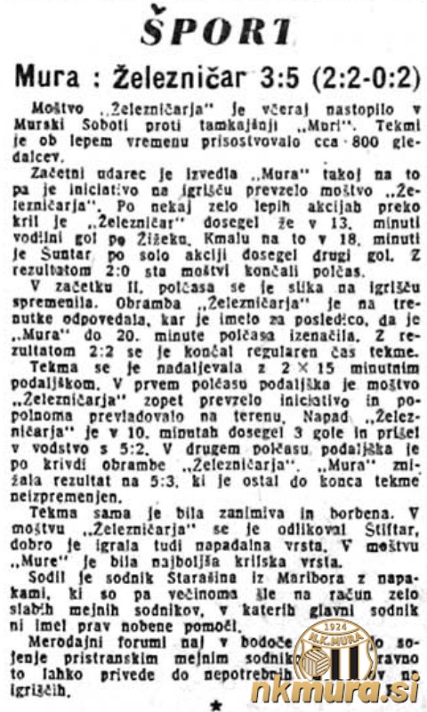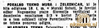 Nogometaši Mure so v 2. krogu pokala ob deseti obletnici Osvobodilne fronte gostili mariborski Železničar in po podaljšku izgubili s 3:5. Polčas se je končal z 0:2, redni del pa z 2:2. Če bi Muraši to tekmo zmagali bi se uvrstili v finalni del tekmovanja na nivoju Slovenije.
