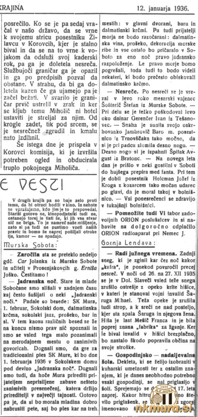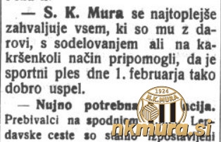 SK Mura je 1. februarja 1936 organizirala športni ples. Ples je tradicionalna prireditev Mure, ki je na sporedu vsako leto na isti datum. Zaradi žalovanja za kraljem Aleksandrom, ga ni bilo le leta 1935.