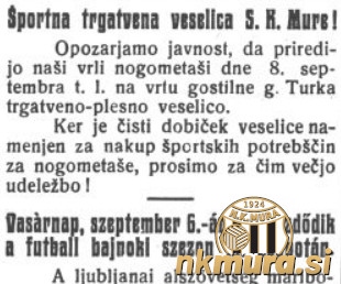 Nogometaši športnega kluba Mura prirejajo 8. septembra 1931 na vrtu gostilne g. Turka trgatveno plesno veselico. Čisti dobiček z veselice bo namenjen novi športni opremi nogometašev - dresi, obutev ...