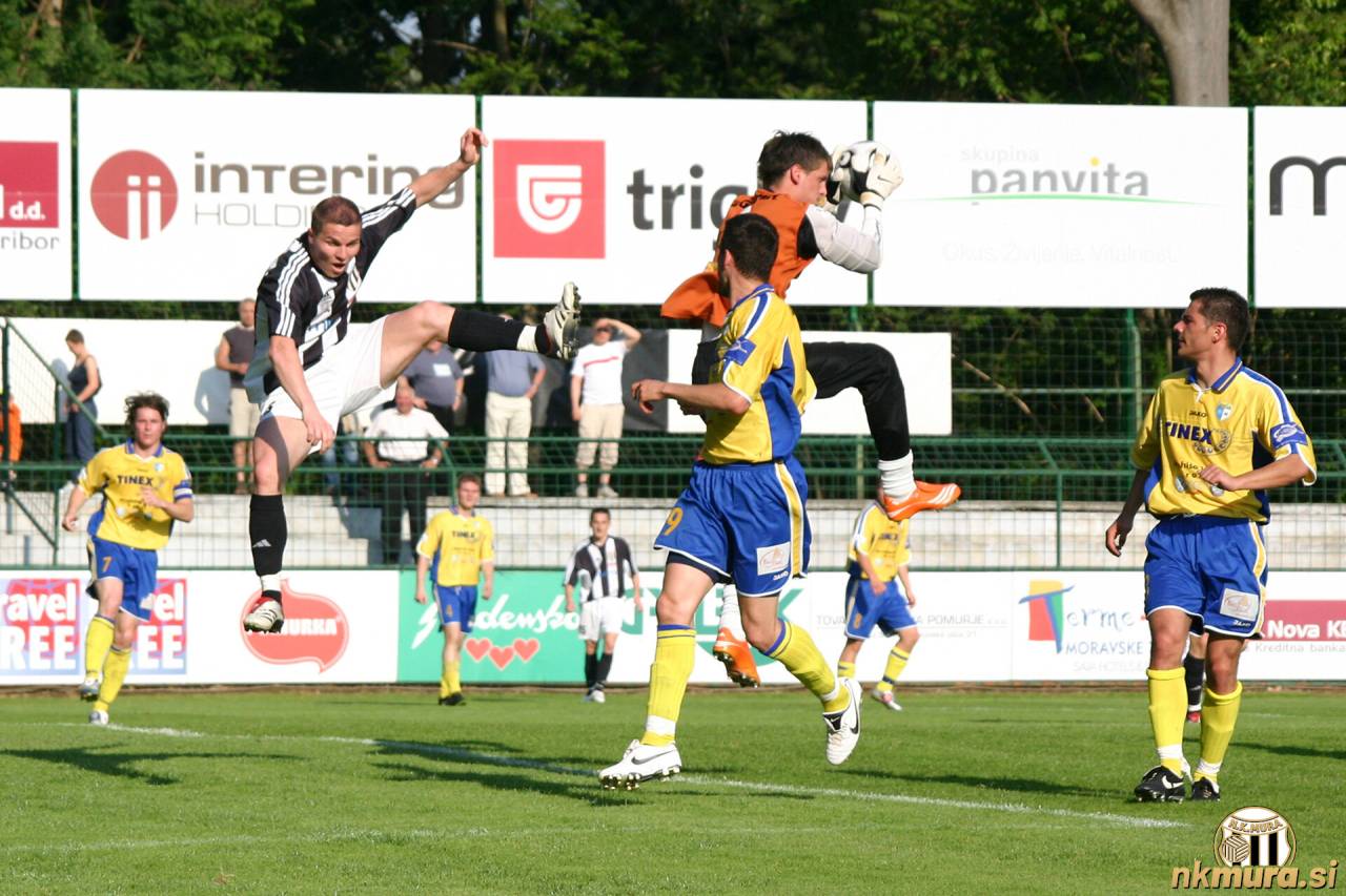 Treba je biti pošten in priznati, da bi se vse skupaj lahko končalo tudi drugače. Zaradi pomembnosti srečanja, so naši začeli precej previdno. Tako so gostje prvi zapretili najprej v 2 nato še 5 minuti vendar je bil Boštjan Kamnik na mestu. V 7. minuti prvi strel črno-belih proti golu. Po centru Denisa Žilavca je bil iz voleja nenatančen Dejan Benkič. Po napaki Tomaža Toplaka na sredini so gostje spet nevarni v 9. minuti, ko je odlično posredoval Boštjan Kamnik in štiri minute za tem, ko je strel zletel mimo vrat. V 16. minuti je z lepo globinsko žogo Branislav Škara iskal Bojana Fajfarja, vendar je bil gostujoči vratar za malo hitrejši. Sledi poizkus Denisa Žilavca z roba kazenskega prostora, žoga zleti za malo čez gol. V 22. minuti po lepem centru Darjana Slavica dober strel Bojana Fajfarja z glavo, vendar se tudi nasprotni vratar ni dal presenetiti. V 28. in 29. minuti dve situaciji, ko so najprej gostujoči potem pa še naši igralci po prekršku nad Fajfarjem zahtevali enajstmetrovki. Vendar je bil sodnik Kranjc drugačnega mnenja. V 33. minuti z dobrih 20 metrov iz prostega strela, rahlo z leve strani gostje nastreljajo stičišče vratnice in prečke. V 40. minuti Boštjan Kamnik na robu kazenskega prostora v zadnjem trenutku lovi žogo pred nasprotnikom. Po podaji Mirana Bencika v zadnji minuti Bojan Fajfar z voleja ustreli za malenkost čez gol.