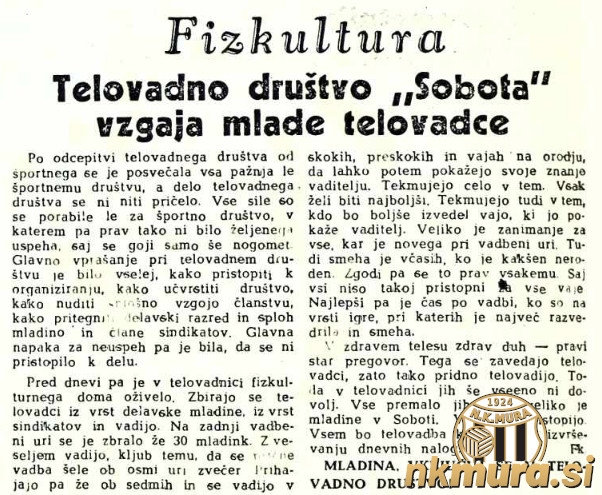 Po ustanovitvi SŠD Sobote je društvo v teoriji gojilo veliko različnih športnih panog. Sčasoma se je izkazalo, da je vodstvo največjo pozornost namenjalo izključno nogometu. Posledica tega je odcepitev telovadnega društva Sobota od športnega, tako da SŠD Sobota goji le še nogomet. Telovadci, ki se zbirajo v telovadnici fizkulturnega doma izvajajo različne vaje v skokih, preskokih in vajah na orodju.