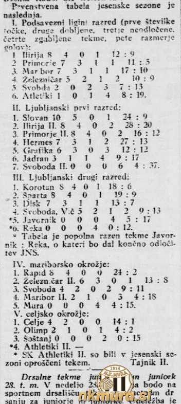 Minilo je že nekaj časa, odkar so končane vse tekme jesenskega dela prvenstva LNP v sezoni 1931/1932. Mura tekmuje v mariborski skupini, kjer zaseda zadnje, peto mesto. V medijih so bile objavljene tudi lestvice ostalih lig LNP.