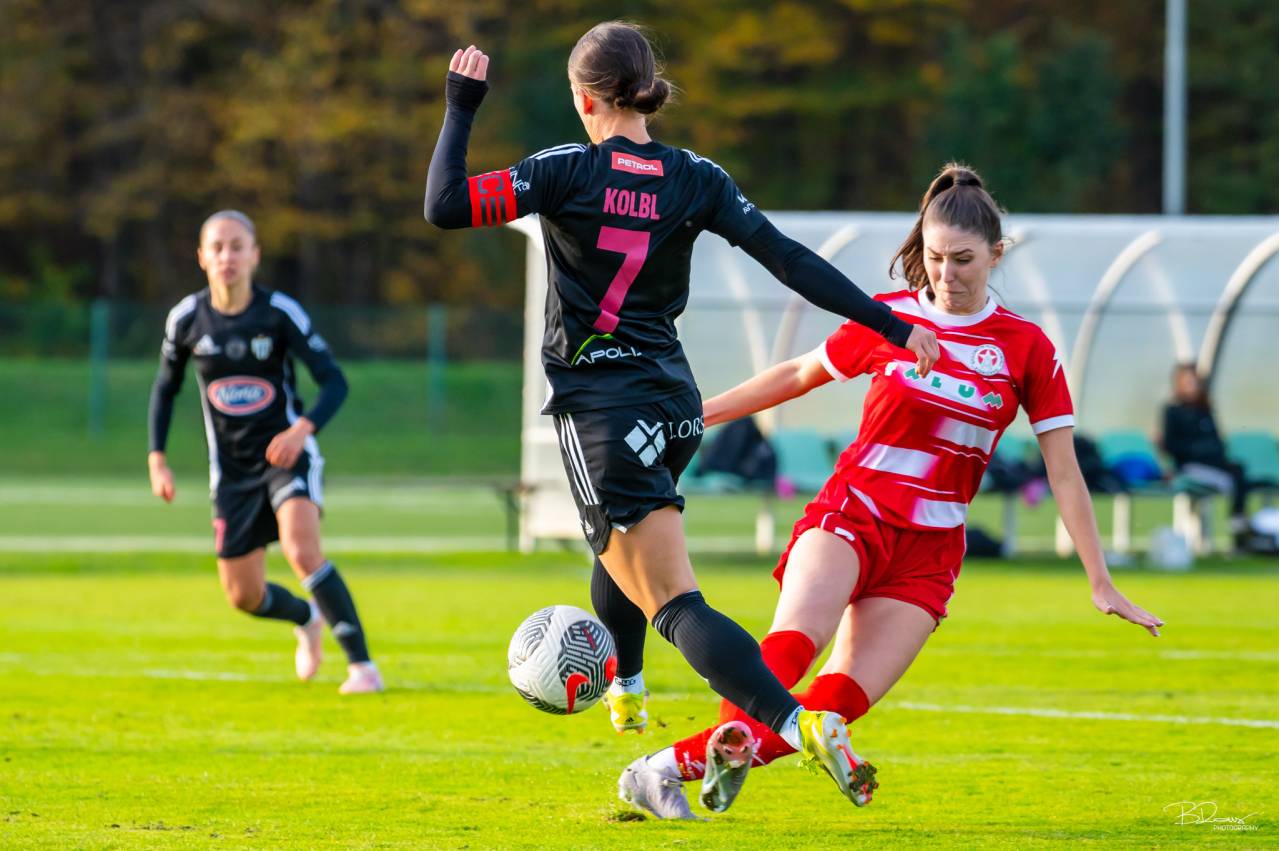 Igralka Aluminija skuša zaustaviti kapetanko Špelo Kolbl. Avtorske pravice: nkmura.si Foto: Boštjan Rous