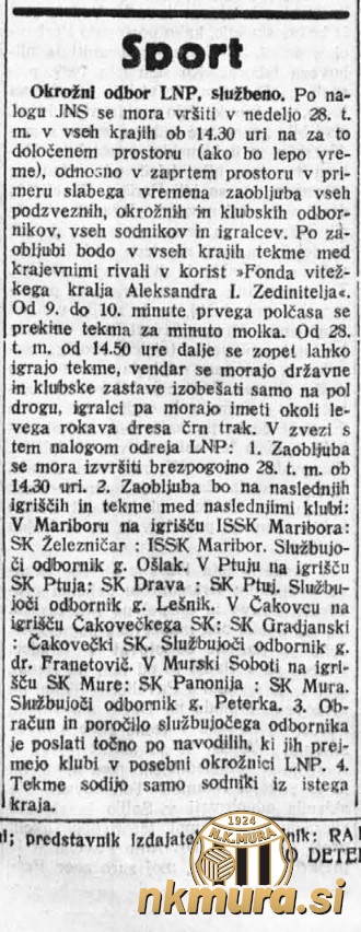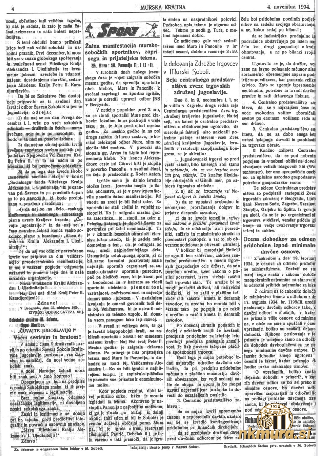 28. oktobra 1934 sta se mestna tekmeca Mura in Panonija pomerila v prav posebni tekmi, katere rezultat je bil na koncu obrobnega pomena. Celotna tekma je bila namreč v znamenju smrti kralja.