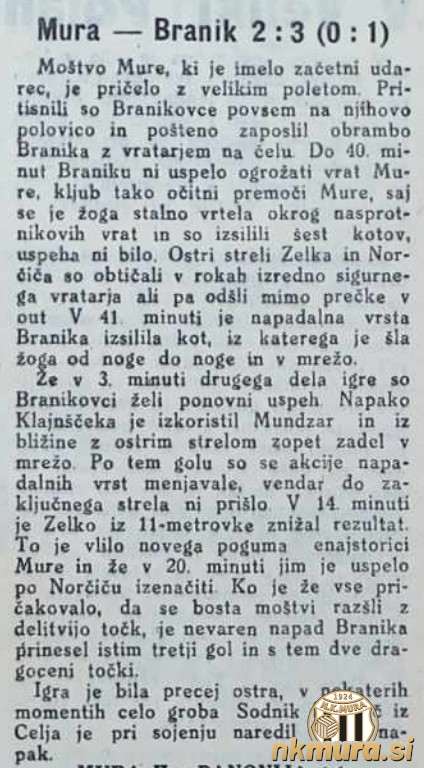Nogometaši Mure so v 16. krogu gostili tradicionalne rivale, mariborski Branik in po razburljivi tekmi izgubili z 2:3 (0:1). Dvoboj modrih in rdečih je na stadion Fazanerija privabil okrog 1500 gledalcev.