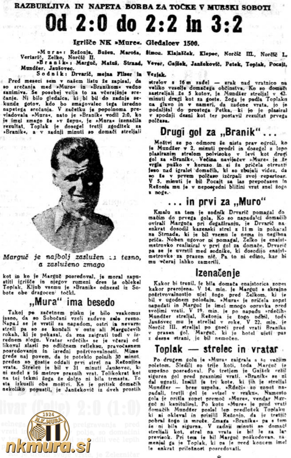 Drugi polčas se ni še niti pošteno pričel, že je Branik zadel za 0:2. V 47. minuti je Mundjar s polvisokim strelom zadel levi kot Režonje. Po zadetku so se akcije menjavale na eni in drugi strani. V 59. minuti je glavni sodnik Drvarič dosodil enajstmetrovko za Muro. Uspešno jo je izvedel Zelko in znižal na 1:2. Zadetek je dal Murašem novega elana in v 65. minuti je Ludvik Norčič iz gneče izenačil na 2:2. Po zadetku so Muraši napeli vse moči, da bi dosegli še tretji zadetek, gostje pa so enkrat izbili iz golove črte. Gostje so povedli po protinapadu. Mundjar je poslal predložek Toplaku, ki ni okleval in je še tretjič prisilil Režonjo, da je pobral žogo iz svoje mreže. Muraši so imeli v zadnji minuti priložnost za izenačenje, vendar so streljali za las prek vrat.
