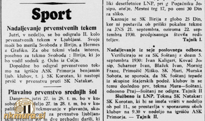 Nogometaši Mure bi morali 28. septmbra 1930 igrati tekmo 2. kroga podeželske lige s Šoštanjem. Tekme ne bo, ker je vodstvo tekmovanja (LNP) Šoštanj iz mariborske skupine premestilo v celjsko skupino. Tako v ligi ostaneta le Mura in Ptuj, ki bosta igrala eno tekmo jeseni in eno spomladi.